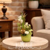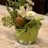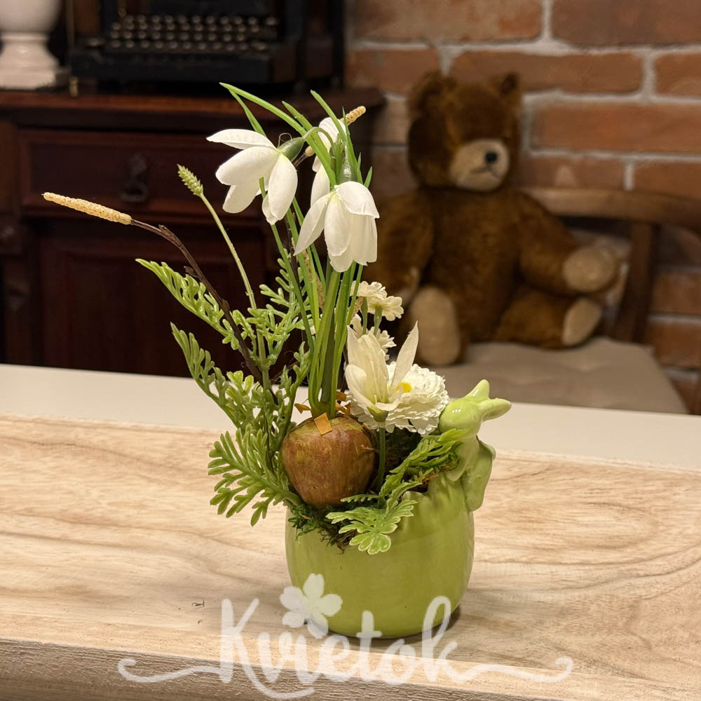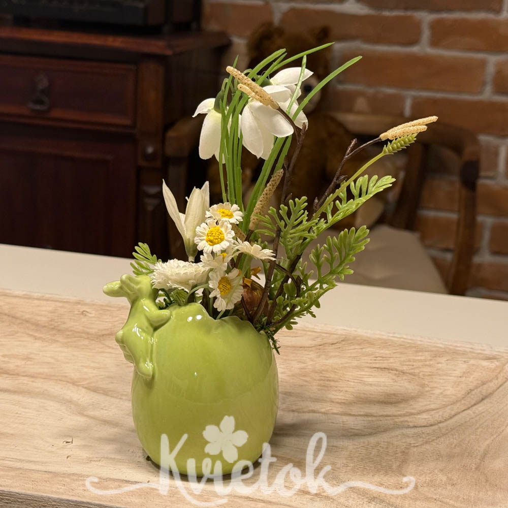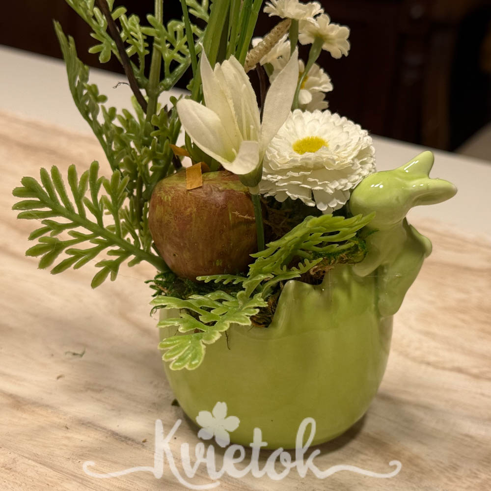 Malý jarný aranžmánik v keramickom obale v tvare škrupiny so zajkom.