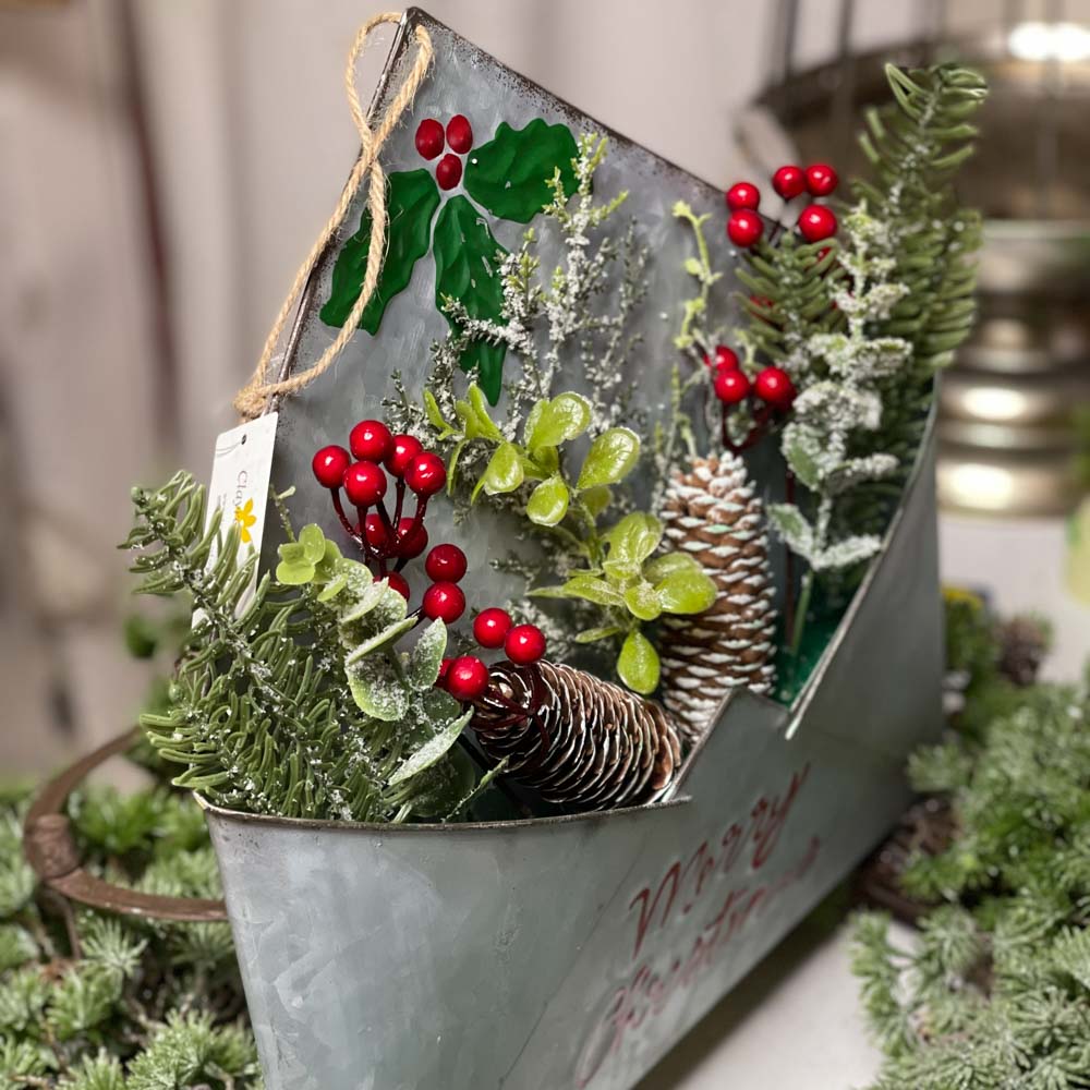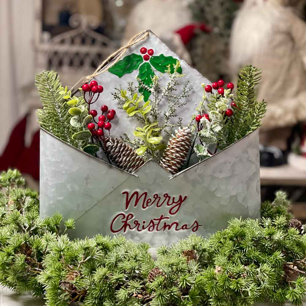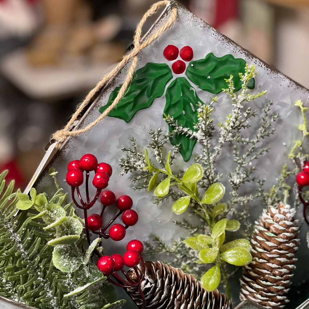 Plechová obálka na zavesenie alebo na položenie, s čečinkou,bobuľkami a šiškami.